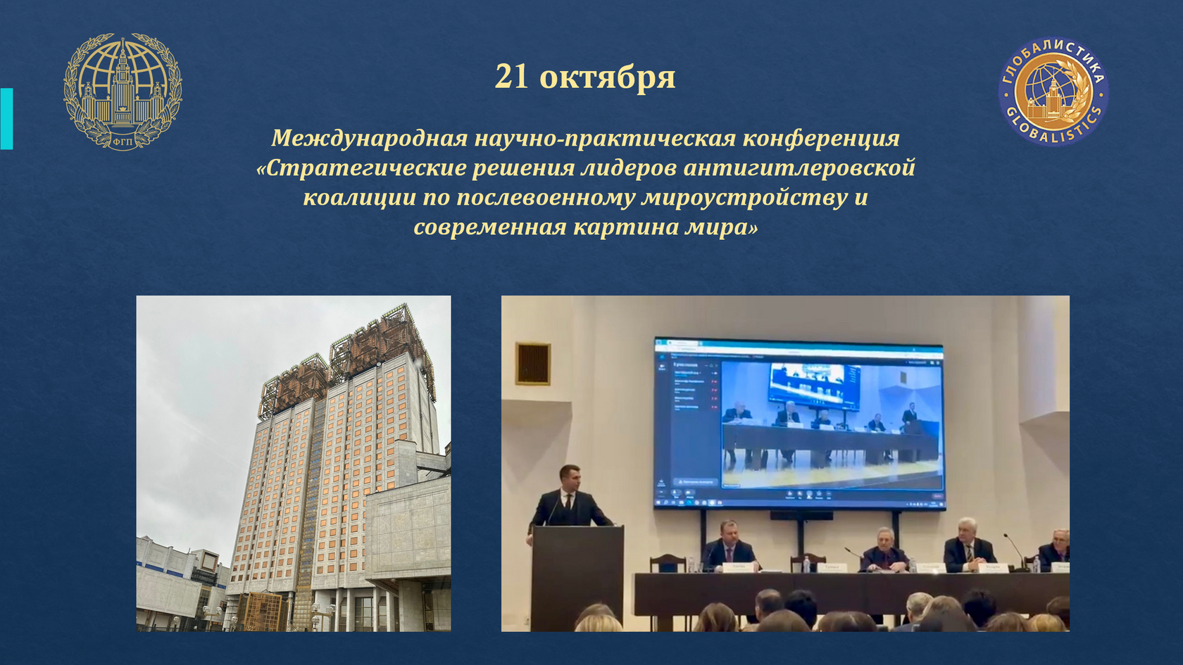 21 октября 2025 года в рамках VIII Международного научного Конгресса «Глобалистика» в здании Президиума Российской академии наук (РАН) состоялась масштабная Международная научно-практическая конференция Комиссии РАН по изучению наследия выдающихся ученых. Мероприятие было посвящено теме: «Стратегические решения лидеров антигитлеровской коалиции по послевоенному мироустройству на Берлинской (Потсдамской) конференции 1945 года. Современная картина мира».